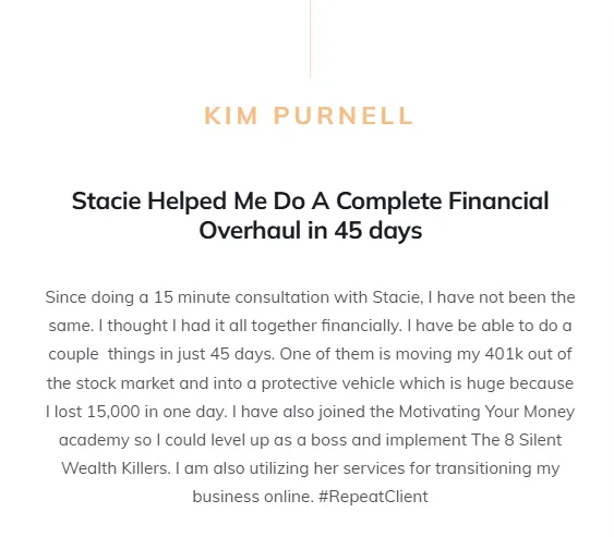 I absolutely loved the Social Media Audit session with Stacie. There was so much needed information that will help my business take off. I’ve been working to make a lot of changes. I appreciate you very much. What stood out most was staying active on social media and making my page attractive, how to structure my personal and business page, and how it should look to attract my friends, new clients and business partners. ~ Tamika Reynolds